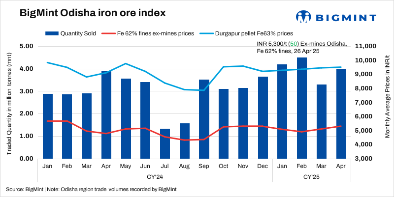 BigMint’s Odisha iron ore fines (Fe 62%) index inched up by INR 50/tonne (t) ($0.5/t) w-o-w to INR 5,300/t ($62/t) ex-mines on 19 April. Around 120,000 t of iron ore fines (Fe 62-65%) were traded in Odisha. Notably, deals for around 900,000 t of iron ore (fines and lumps) were recorded from Odisha this week amid active buying interest.