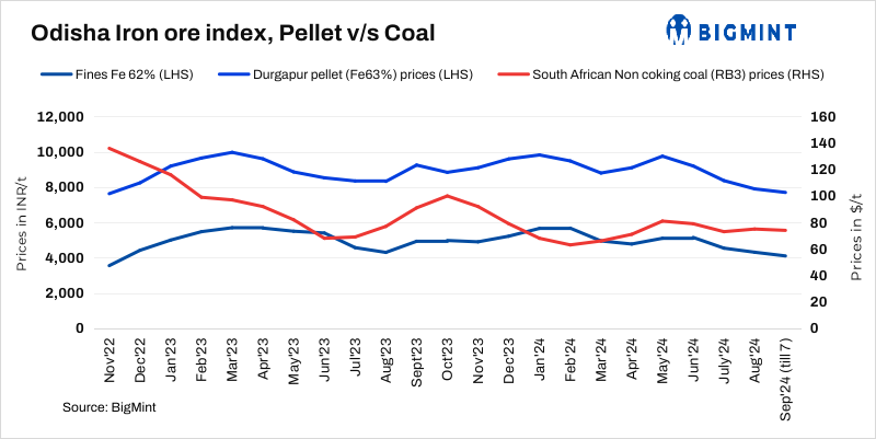 - Pellet prices stable, exports sharply fall w-o-w: Pellet (6-20 mm, Fe 62.5%) prices in Odisha’s Barbil remained unchanged w-o-w. The current assessment stands at INR 7,050/t ($84/t) loaded to wagon. Pellet (Fe 62.5%, 6-20 mm) prices in Durgapur remained stable at INR 7,700/t ($92/t) exw on 30 August. BigMint’s India pellet (Fe 63%, 3% Al) export index (FOB East Coast) significantly decreased by $11.5/t w-o-w to $83.5/t on 6 September with no deals.
