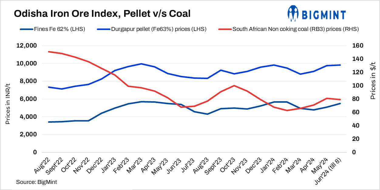 BigMint’s Odisha iron ore fines (Fe62%) index inched down by INR 50/t ($1/t) w-o-w to INR 5,450/t ($65/t) ex-mines on 8 June, 2024. No deals for Fe62% fines were recorded this week amid weak market sentiments. Trading activities slowed down this week; however, a buyer booked around 50,000 t of fines (Fe 60%) in this publishing window.
