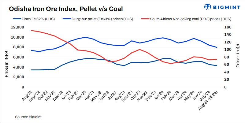 BigMint’s Odisha iron ore fines (Fe 62%) index decreased by INR 100/t ($1/t) w-o-w, settling at INR 4,200/t ($50/t) ex-mines as of 24 August, 2024. Over the past week, around 200,000 tonnes (t) of iron ore by the private miners post OMC auction.