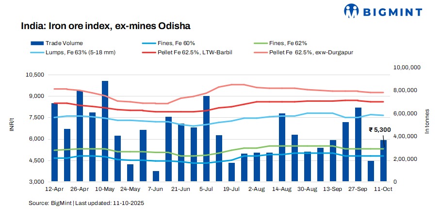 BigMint’s Odisha iron ore fines (Fe 62%) index remained stable w-o-w at INR 5,300/tonne (t) ($60/t) ex-mines on 11 October 2025. BigMint recorded around 370,000 t of iron ore deals this week, concluded directly by the steelmakers.