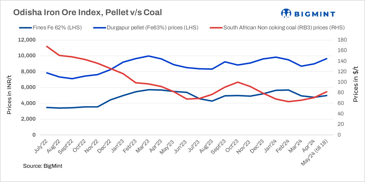 - Pellet offers stable d-o-d: Pellet (6-20 mm, Fe 62.5%) prices in Odisha’s Barbil remained stable w-o-w. The current assessment stands at INR 8,700/t ($104/t) loaded to wagon. Pellet (Fe 62.5%, 6-20 mm) prices in Durgapur remained increased w-o-w to INR 9,700/t ($116/t) exw on 17 May. Meanwhile, BigMint’s India pellet (Fe 63%, 3% Al) export index (FOB east coast) decreased by $1/tonne (t) w-o-w to $103.5/t on 15 May.