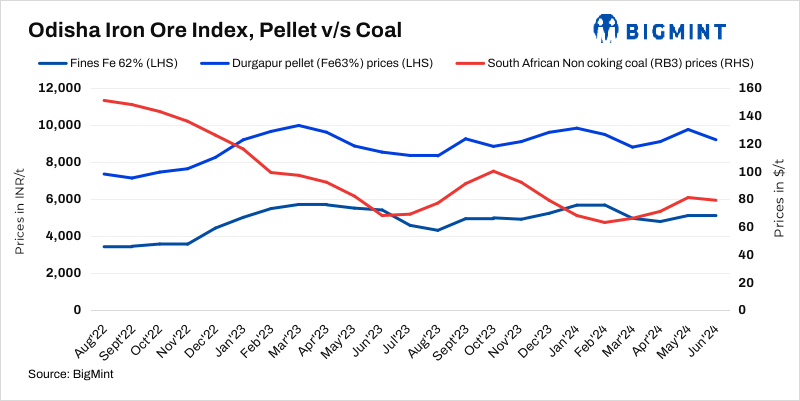 BigMint’s Odisha iron ore fines (Fe62%) index inched down by INR 50/t w-o-w to INR 4,750/t ($56/t) ex-mines on 29 June, 2024. No deals of standard Fe 62% fines deal recorded from the merchant miners. However, around 125,000 t iron ore deals were concluded in the Odisha region by the steelmakers this week.
