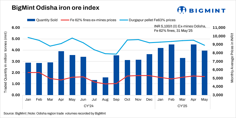 BigMint’s Odisha iron ore fines (Fe 62%) index remained stable w-o-w at INR 5,100/t ($60/t) ex-mines on 31 May. Notably, deals of around 460,000 t of iron ore (fines and lumps) were recorded by BigMint in Odisha, which were concluded at lower, discounted prices this week.