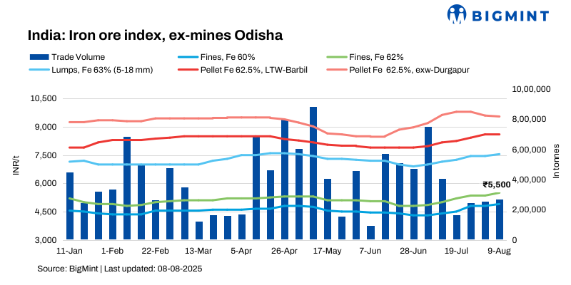 BigMint’s Odisha iron ore fines (Fe 62%) index rose by INR 150/t (2/t) w-o-w at INR 5,500/tonne (t) ($63/t) ex-mines on 8 August 2025. This week, demand was present in the market, but the offered volume was low, and buyers were cautious due to rising prices.
