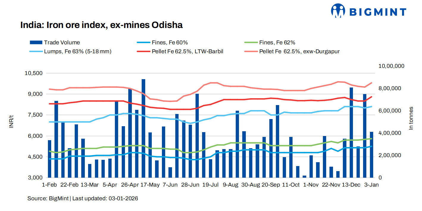 Iron ore prices in the Odisha market remained firm this week, as assessed on 3 January 2026, supported by active trading activity and a sharp improvement in downstream steel prices. Market participants noted that trades are now getting concluded at higher levels, while availability of material remains limited.