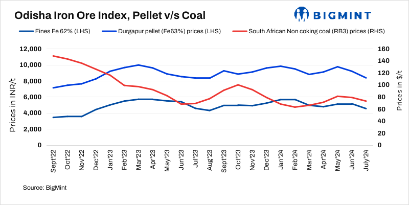 - Domestic, export pellet prices under pressure: Pellet (6-20 mm, Fe 62.5%) prices in Odisha’s Barbil fell by INR 100/t w-o-w w-o-w. The current assessment stands at INR 7,400/t ($94/t) loaded to wagon. Pellet (Fe 62.5%, 6-20 mm) prices in Durgapur inched down by INR 50/t w-o-w to INR 8,350/t ($107/t) exw on 26 July. BigMint’s India pellet (Fe 63%, 3% Al) export index (FOB east coast) decreased by $4/t w-o-w to $93/t on 26 July 2024.