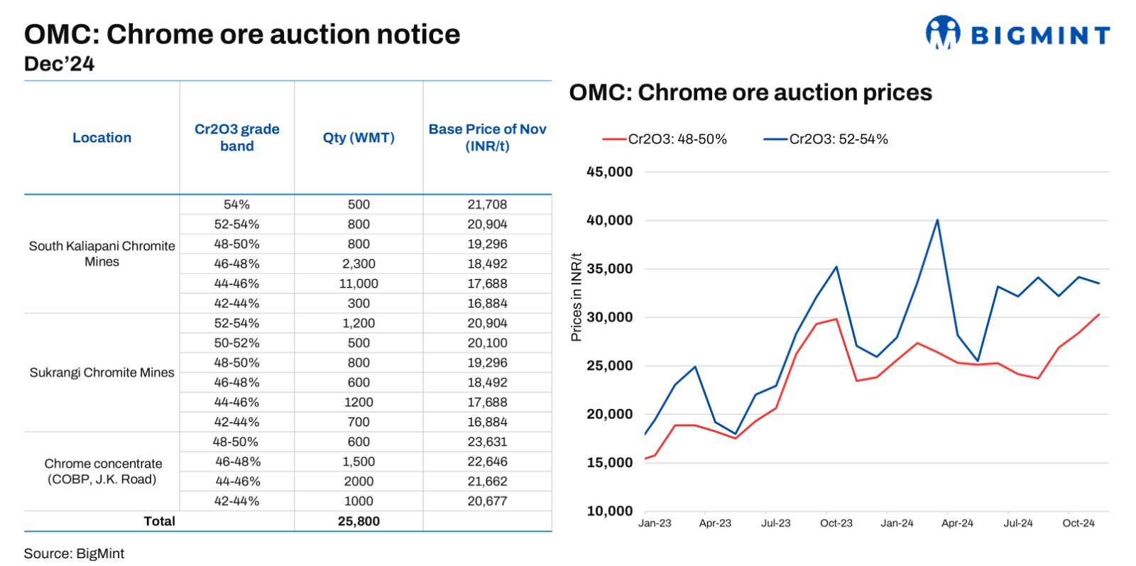 OMC slashed its base price of chrome ore (Cr2O3: 42-54%; 25,800 t offered) from South Kaliapani and Sukrangi mines by 6% m-o-m for the Dec’24 auction, tracking a 3% m-o-m dip in ferro chrome prices (as per BigMint’s assessment on 13 Dec). Meanwhile, the base price of chrome concentrates (Cr2O3: 42-50%) from COBP, JK Road, rose 3% m-o-m, with total allotment down 7,800 t from the last auction, to 25,800 t.