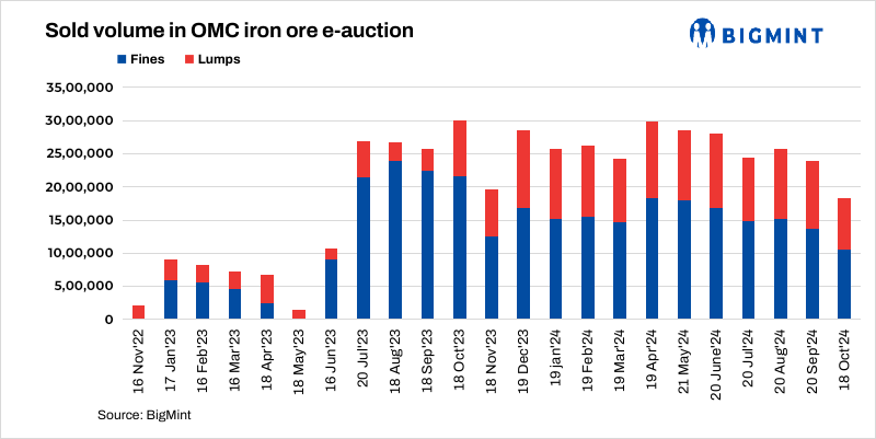 Odisha Mining Corporation (OMC) has announced a scheduled auction of approximately 2 mnt of iron ore, (*0.87 mnt of lumps and *1.15 mnt of fines) on 20 Nov’24. The miners reduced lump base prices by INR 950/t m-o-m but kept iron ore fines prices stable. This decision was due to drop of over INR 2,000/t in sponge C-DRI prices in the eastern region after last month’s OMC auction.