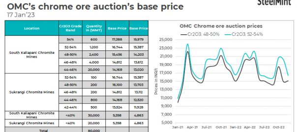 State-owned miner OMC has increased the base price for its upcoming chrome ore auction on 17 Jan’23. The base price has been raised by 9% over the previous auction on 16 Dec due to a hike in ferro chrome prices. As per SteelMint’s assessment, ferro chrome prices have risen by 10% m-o-m as on 12 Jan’23 against prices on 15 Dec’22.