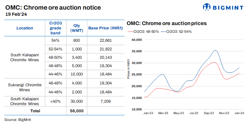 OMC has adjusted the base price marginally for its forthcoming auction of 56,000 t of chrome ore from South Kaliapani and Sukrangi mines on 19 Feb’24.it has also increased the offered material volume by 10,800 t m-o-m primarily due to the inclusion of more low-grade ore. The base price increased by around INR 319-392 (2%) m-o-m for 44-54% grade material.