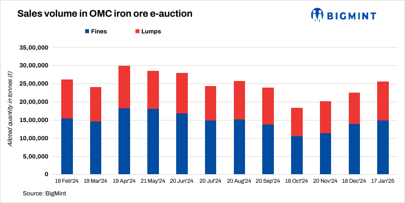 OMC has scheduled an auction for 2.617 mnt of iron ore (1.098 mnt lumps and 1.519 mnt fines) on 19 Feb’25. The miner has increased base prices by INR 200-300/t and INR 150/t m-o-m for fines and lumps, respectively, and INR 850/t for Fe55% fines. Hike in pellet prices, tight availability of high-grade ore and increasing export prices have supported the base price hike.