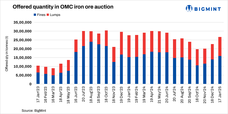 OMC has scheduled an auction for 2.667 mnt of iron ore, (1.078 mnt lumps and 1.589 mnt fines) on 17 Jan’25. The miner increased fines and lump base prices by INR 100/t and INR 150/t m-o-m, respectively. Due to limited availability of iron ore in eastern India, OMC increased the base prices and also raised the offered quantity by 0.4 mnt compared to last month.
