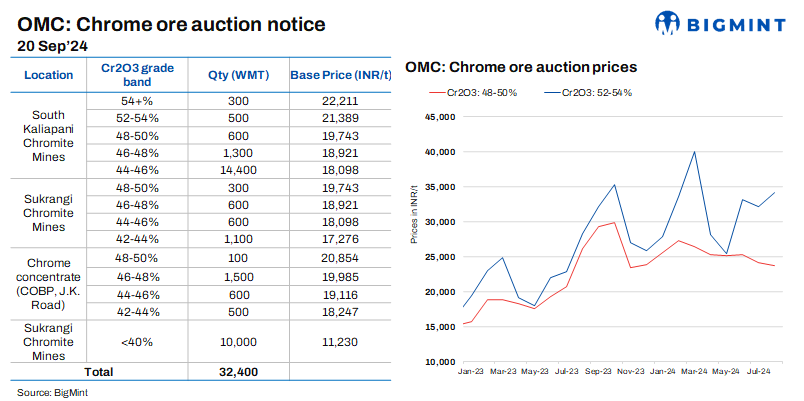 OMC will auction 32,400 t of chrome ore on 20 Sep’24, with the offered quantity declining by 22,400 t m-o-m. However, base prices have risen 7-13% (INR 1,188-2,468) for most grades and 72% (INR 4,715) for grades below 40%. The drop in quantity is likely due to the monsoon-led reduction in output and lower Chinese ferro chrome tender prices.