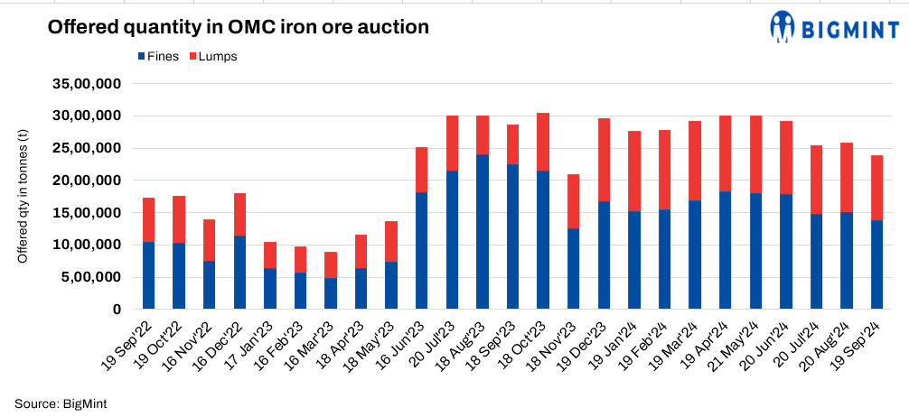Odisha Mining Corporation (OMC) has announced a scheduled auction of approximately 1.98 mnt of iron ore, (0.92 mnt of lumps and 1.06 mnt of fines) on 18 Oct’24. The base prices for both fines and lumps have been increased by INR 850-1,800/t m-o-m. This hike follows rising iron ore and pellet prices, coupled with a reduction in dispatches from Odisha, driving the miner to adjust its base prices accordingly.