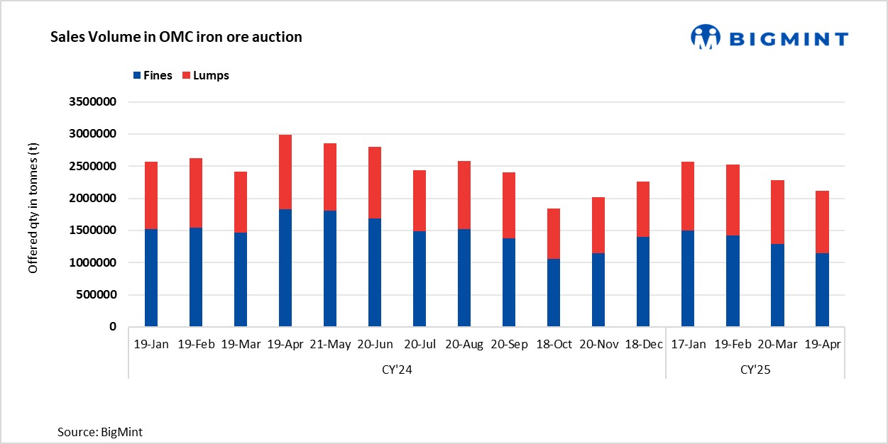 OMC has scheduled an auction for 2.353 mnt of iron ore (1.025 mnt of lumps and 1.328 mnt of fines) on 19 May’25. The miner reduced base prices by INR 50-100/t ($0.5-1/t) and INR 450/t ($5/t) m-o-m for fines and lumps, respectively, amid weak demand in downstream segments. A drop in sponge iron prices m-o-m also weighed on OMC’s offers.