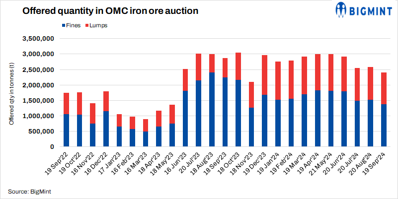 Odisha Mining Corporation (OMC) has scheduled an auction for around 2.38 mnt of iron ore (1.01 mnt of lumps and 1.37 mnt of fines) on 20 Sep’24. The company has rolled over base prices in both fines and lumps for majority of the lots except a few witnessing marginal reduction of INR 150/t.