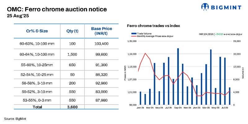 Odisha Mining Corporation (OMC) will conduct an auction on 25 Aug’25 for 3,600 t of ferro chrome across various grades and sizes (Cr: 50-64%, 0-100 mm). The base price for the bigger lot of 1,500 t (Cr: 60-64%, 10-100 mm) has been set at INR 99,600/t ($1,139/t) exw. Meanwhile, the base price for a smaller lot of 100 t (Cr: 60-63%, Si:2%, 10-100 mm) is set at INR 103,400/t ($1,182/t) exw.