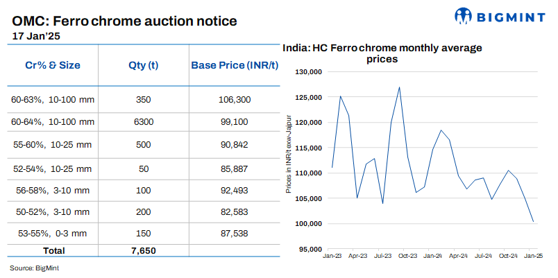 Odisha Mining Corporation (OMC) has scheduled an e-auction on 17 Jan’25 for 7,650 t of different grades of high-carbon ferro chrome (Cr: 50-64%, 0-100 mm). The base price of the bigger lot of 6,300 t (Cr: 60-64%, 10-100 mm) has been set at INR 99,100/t. BigMint assessed ferro chrome (HC60%, 10-150 mm) prices at INR 99,100/t exw-Jajpur on 15 Jan’25.