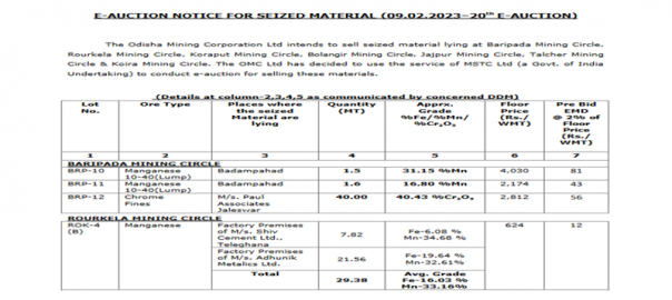 Odisha Mining Corporation (OMC) will conduct an auction for 71,574 t of chrome ore and 28,987 t of manganese ore of different grades and sizes on 9 Feb’23. The offered material is from OMC’s Baripada, Rourekela and Talcher mining circles.