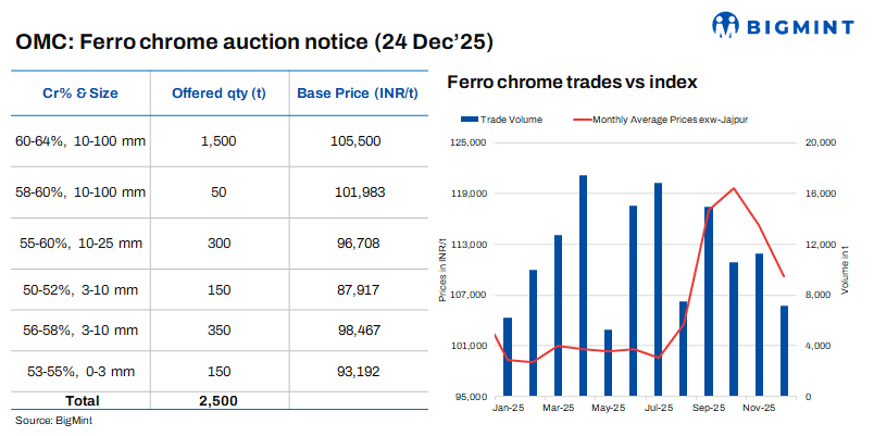 Odisha Mining Corporation (OMC) has scheduled an auction on 24 Dec’25 for 2,500 t of high-carbon ferro chrome across multiple grades and sizes (Cr: 50-64%, 0-100 mm). The base price for the largest lot of 1,500 t (Cr: 60-64%, 10-100 mm) is set at INR 105,500/t exw. BigMint assessed HC ferro chrome (Cr: 60%, 10-150 mm) prices at INR 107,400/t exw Jajpur on 19 December.