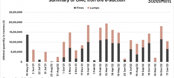 Odisha Mining Corporation (OMC) has scheduled an auction for 1.05 mnt of iron ore (650,000 t of fines, Fe54-64% and 400,000 t of lumps, Fe62%) on 17 Jan’23. The floor price for fines is INR 2,800-5,450/t while that for lumps is INR 6,300-11,150/t, higher by up to INR 1,250/t and INR 3,650/t respectively compared to 16 Dec’22 auction. Prices include royalty, DMF, and NMET charges.