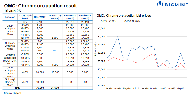 At OMC’s chrome ore auction today, 50,500 t were booked out of the 76,000 t offered. Bids for Cr2O3 >48% grades (barring COBO, J.K Road material) fell sharply by 21-32% (INR 5,658-11,027/t) m-o-m. Other grades saw a slight gain of 1-2% (INR 51-432/t). Weak demand from the stagnant stainless steel and ferro chrome markets led to subdued auction participation.