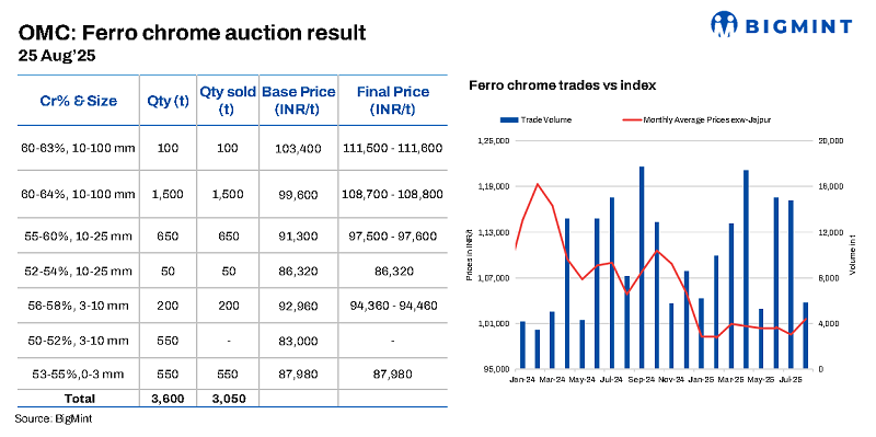 At OMC’s ferro chrome auction yesterday, 3,050 t was sold from 3,600 t offered. As per reliable sources, the 1,500 t lot (Cr: 60-64%, Si: 4%, 10-100 mm) was booked in the price range of INR 108,700 – 108,800/t exw, up by INR 9,100- 9,200/t over base price. Another 100 t high-carbon lot (Cr: 60-63%, Si: 2%) closed at INR 111,500-111,600/t exw . Tight supplies and a rise in bids at the recent chrome ore auction likely contributed to the increase.