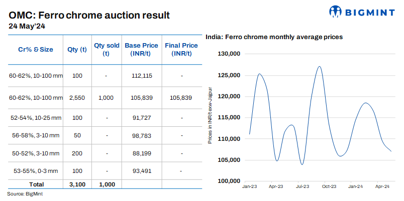 At OMC’s ferro chrome auction yesterday, 1,000 t (Cr: 60-62%, 10-100 mm) out of 3,100 t was sold at the base price of INR 105,839/t. The tepid response seen in the auction can be attributed to the subdued conditions prevailing in the ferro chrome market. BigMint assessed ferro chrome (HC60%, 10-150 mm) prices at INR 106,300/t exw-Jajpur on 24 May’24.