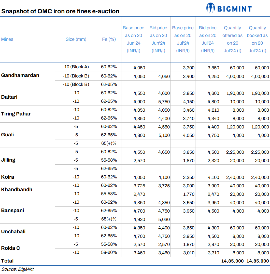 In OMC’s auction for 1.485 mnt of iron ore fines (Fe 54-65%) on 20 Jul’24, entire quantity was booked. Bids decreased around INR 150-400/t for the majority of fines lots against last month owing to a drop in pellet and sponge iron prices. However, response remained active amidst restocking ahead monsoons.