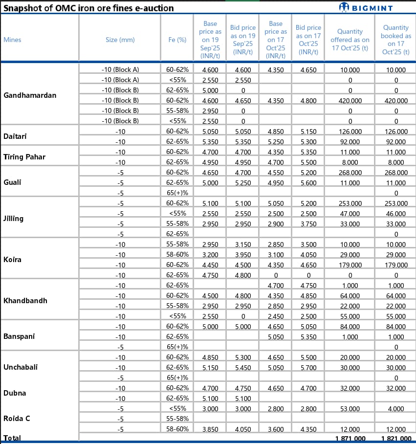 In OMC’s iron ore fines auction of 1.871 mnt (Fe 51-62%) on 17 Oct’25, around 1.82 mnt (97%) of fines were booked at INR 2,500-5,700/t. Bids (weighted average) rose marginally by INR 50/t m-o-m. The stability in bid prices was due to material shortage and lower production volumes due to extended monsoons.