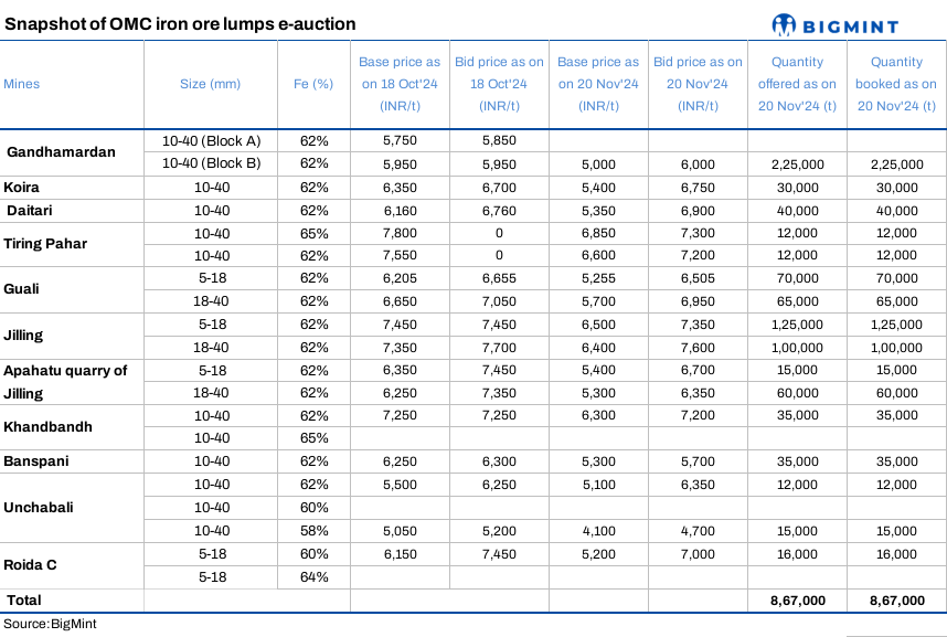 OMC auctioned 0.867 mnt of iron ore lumps (Fe 58-64%) on 20 Nov’24, of which 100% material was booked at INR 4,700-7,600/t with a premium of INR 400-1,550/t over the base prices. Steelmakers actively responded to the auction, with bids (weighted average) surging by around INR 50/t m-o-m. The miner reduced base prices by INR 950/t m-o-m for the lumps lots.