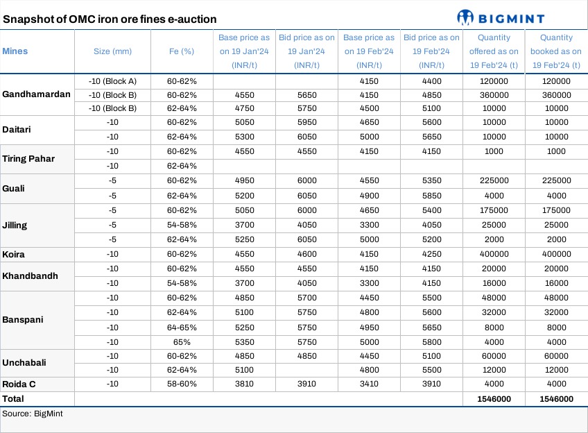 OMC conducted an auction for 1.546 mnt of iron ore fines (Fe 54-65%) on 19 Feb’24. The entire quantity was booked at INR 3,910-5,850/t. Bids increased by INR 100-1,050/t against the base prices. However, bid prices fell up to INR 850/t for the majority of lots against OMC’s Jan auction owing to a drop in pellet offers in central and eastern India.