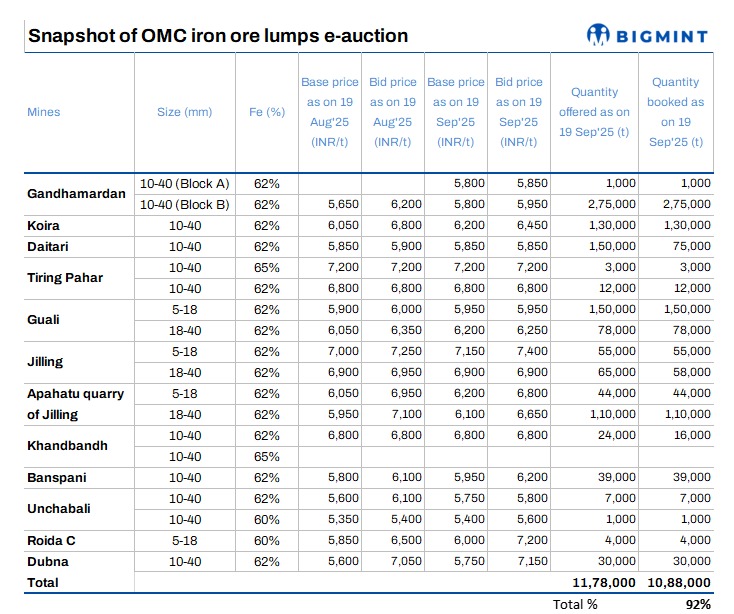 In OMC’s auction for 1.178 mnt of iron ore lumps on 19 Sep’25, around 1.088 mnt (Fe 60-65%) were booked at INR 5,600-7,400/t, with premiums of INR 50-1,400/t on the base prices. Weighted average bids fell by around INR 100/t m-o-m. Earlier, the miner had increased base prices by INR 50-150/t m-o-m for some lots. Weak steel market sentiments led to the drop in bids.