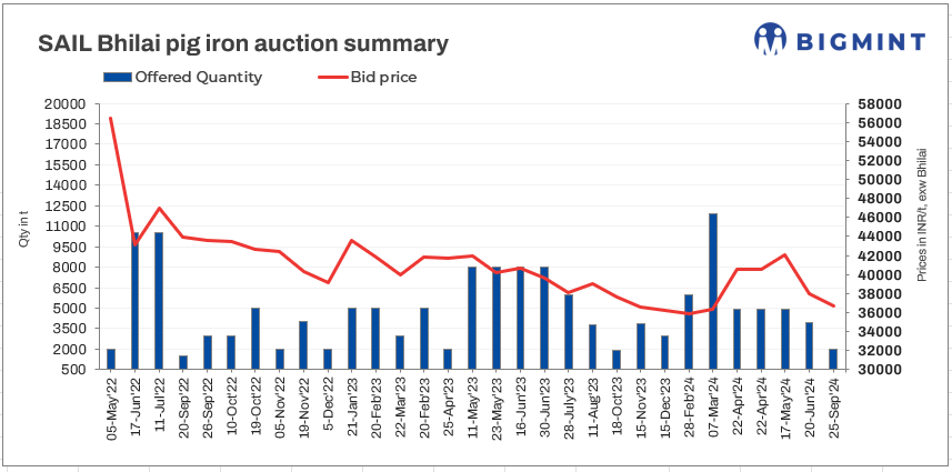 SAIL-BSP held an auction for 1,850 t of steel-grade pig iron on 25 Sep’24. The total quantity was booked at an average price of INR 36,750/t exw. In the previous auction, conducted on 20 Jun’24 for 3,950 t of steel-grade pig iron, the entire volume was booked at an average price of INR 38,000/t exw.