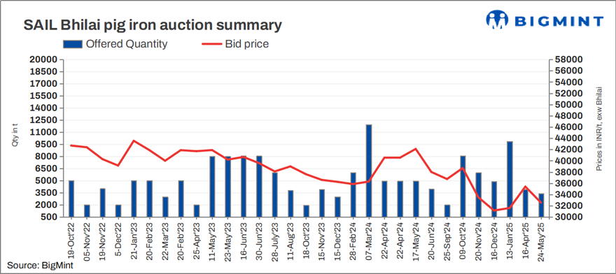 SAIL-BSP held an auction for 3,380 t of steel-grade pig iron on 24 May’25, in which the entire quantity was booked at an average price of INR 32,550/t exw. In the previous auction, conducted on 16 Apr for 3,900 t of steel-grade pig iron, the entire volume was booked at an average price of INR 35,400/t exw.