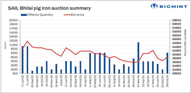 SAIL-BSP held an auction for 8,050 t of steel-grade pig iron on 09 Oct’24. The total quantity was booked at an average price of INR 38,700/t exw. In the previous auction, conducted on 25 Sep’24 for 1,850 t of steel-grade pig iron, the entire volume was booked at an average price of INR 36,750/t exw.