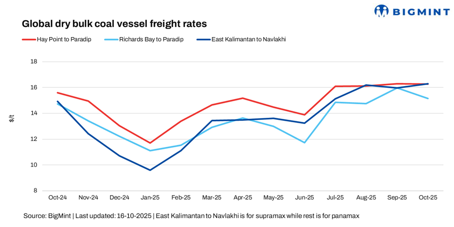 Dry bulk coal freight rates continued to reflect a mixed performance this week amid ongoing market uncertainty and limited trading momentum. The Indonesia-India route saw a slight decline, driven by muted cargo demand and a lack of active fixtures. Meanwhile, the South Africa-India route remained unchanged, with chartering activity subdued as market participants adopted a wait-and-see approach. Overall, sentiment across the market stayed cautious, with weak fundamentals and restrained buying interest keeping freight levels under pressure.
