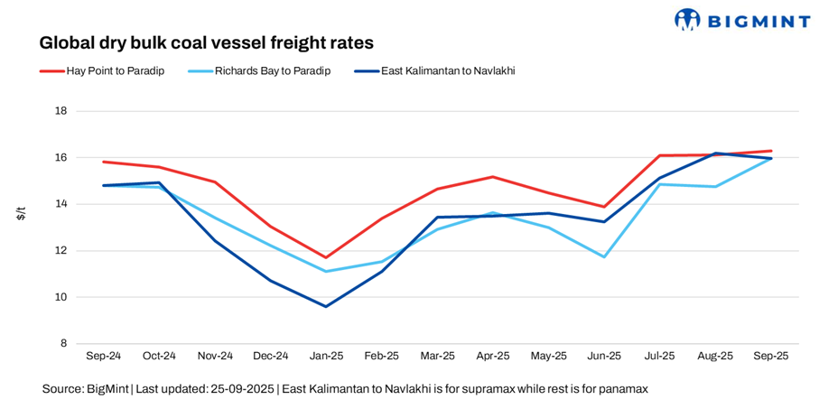 Dry bulk coal freights showed a mixed trend this week. Indonesia-India rates eased, while Panamax freights on the South Africa-India and Australia-India routes showed strength. Trading activity remained largely subdued, with the Australia-India lane being the only active route, though volatility in rates hinted at downside risks, leading to just a single fixture by an Indian steelmaker.