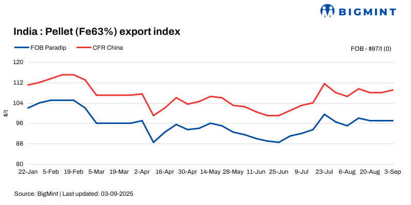 BigMint’s India pellet (Fe 63%, 3-3.5% Al) export index (FOB east coast) remained stable at $97/t on 3 September 2025 against 27 August.