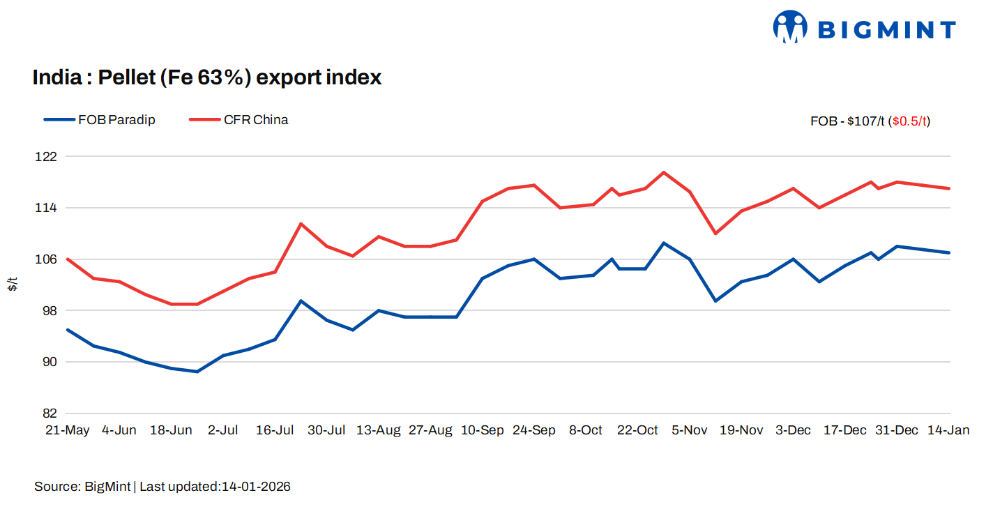 Pellet prices in the seaborne market remained largely rangebound over the past few days on 14 January 2026, though minor price fluctuations were observed amid subdued trading activity. Market sentiment continued to weaken in the Indian seaborne market, primarily due to elevated iron ore and pellet inventories at Chinese ports, which have restrained fresh buying interest from end-users.