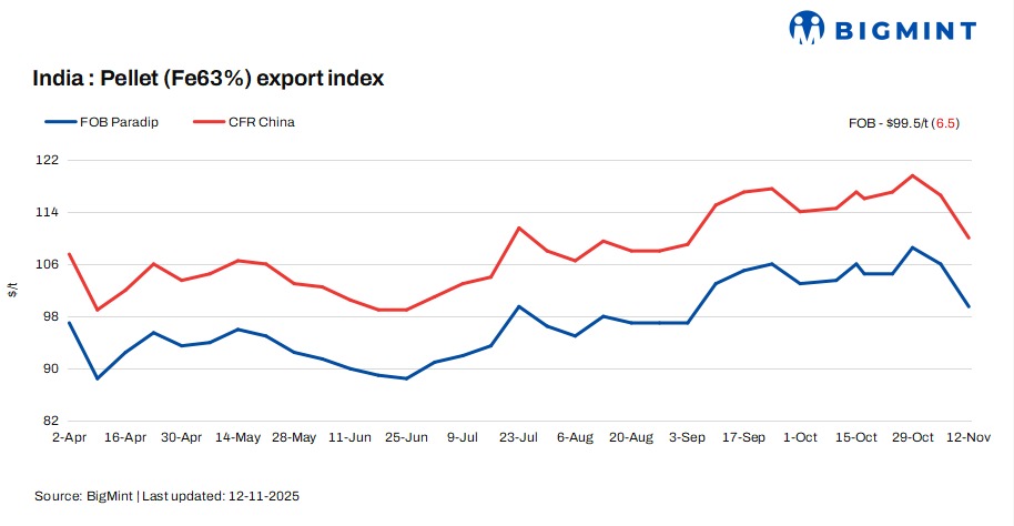 BigMint’s India pellet (Fe 63%, 3-3.5% Al) export index fell by $6.5/tonne (t) w-o-w to $99.5/t FOB east coast on 12 November against 5 November.