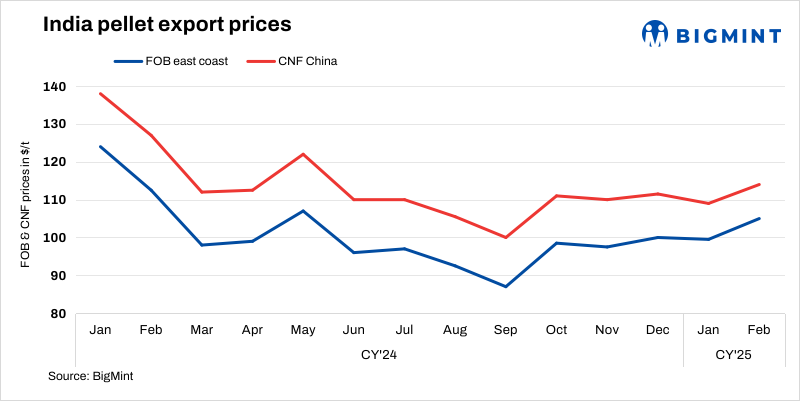 BigMint’s India pellet (Fe 63%, 3% Al) export index (FOB east coast) remained stable w-o-w at $105/tonne (t) on 19 February 2025. An eastern India-based exporter sold 75,000 t (Fe62%) at $115.5/t CFR China, while another supplier sold 55,000 t (Fe63%) at $117/t CFR China towards the end of last week.