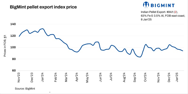 BigMint’s India pellet (Fe 63%, 3% Al) export index (FOB eastern coast) fell by $2/tonne (t) w-o-w to $94/t on 8 January 2025. No deal was recorded from India’s east coast over the course of the week.