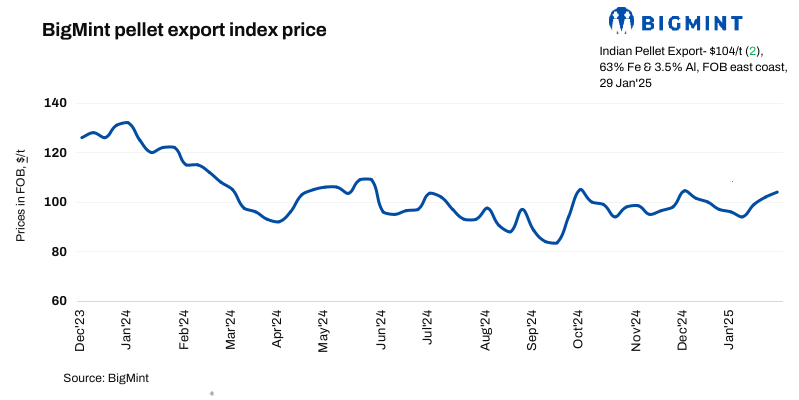 BigMint’s India pellet (Fe 63%, 3% Al) export index (FOB eastern coast) rose by $2/tonne (t) w-o-w to $104/t on 29 January 2025. Three cargoes of 175,000 t (Fe 63%, 7-8% AL2O3+SiO2) were concluded at $111-113/t CFR China, scheduled for February from suppliers in Odisha.