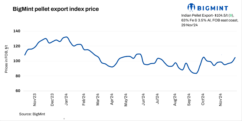 BigMint’s India pellet (Fe 63%, 3.5% Al) export index (FOB east coast) increased by $9/t w-o-w to $104.5/t on 29 Nov’24 following active deals. An Eastern Indian seller concluded a 75,000 t pellet (Fe63%, max 8% Al2O3+SiO2) export cargo deal today for Dec loading. Bullish market sentiments due to the global fines index have supported pellet export prices. A few more deals are expected in the short term.