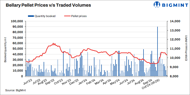 Pellet (Fe63%) prices in Bellary decreased by INR 100/t ($1/t) to INR 10,300/t ($123/t) exw on 29 Oct’24 compared to 25 Oct. 2,000 t of deals were concluded at INR 10,300/t ($123/t). Pellet prices remained under pressure as trade activity slowed before Diwali, and finished steel prices continued to decline. PDRI prices decreased by INR 200/t ($2/t) d-o-d to INR 26,000/t exw ($309/t).