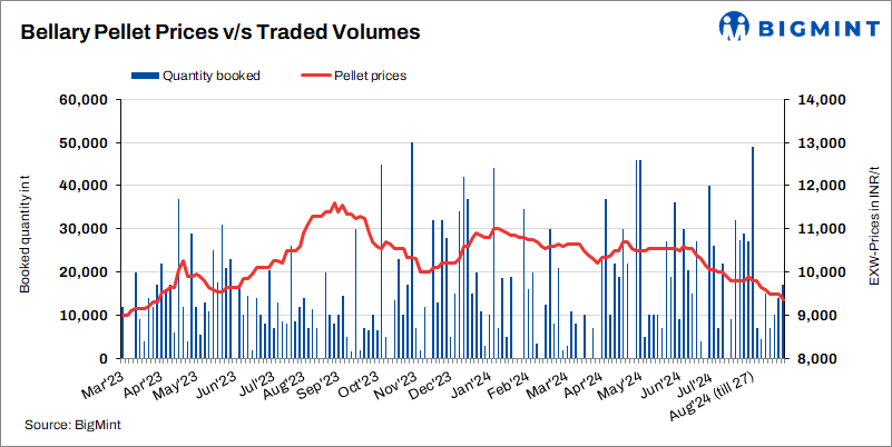 Pellet (Fe63%) prices in Bellary, Karnataka dropped by INR 150/t ($2/t) to INR 9,350/t ($111/t) exw on 27 Aug’24 compared to 23 Aug. Around 17,000 t of deals were recorded at INR 9,300-9,400/t ($111-112/t). Sponge iron (P-DRI) prices were largely stable w-o-w at INR 25,800/t ($307/t) exw. Decline in sponge prices and lower offers of pellet have pressurised prices in the region.