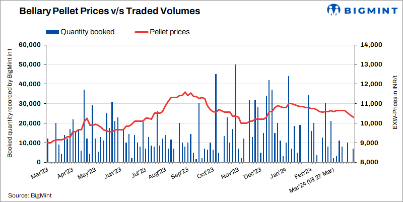 Pellet (Fe 63%) prices in Bellary, Karnataka dropped by INR 100/t to INR 10,300/t exw on 27 Mar’24 compared to 22 Mar. A deal of around 7,000 t pellet concluded at INR 10,200/t exw. Sluggish market sentiment amid festival holidays and drop in NMDC pellet auction base price have weighed on pellet prices in the region.