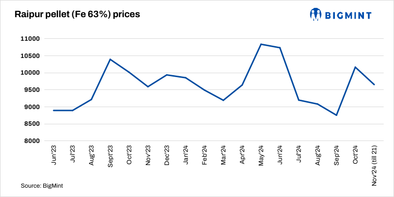 Raipur-based pellet makers reduced their Fe63% (+/_0.5%) offers on 21 Nov by INR 400/t ($5/t) to INR 9,000-9,100/t ($107-108/t) exw after yesterday’s OMC iron ore auction, where bids (weighted average) dropped INR 300/t ($4/t) against Oct’24. GPIL lowered Fe63.5% and Fe65.5% offers to INR 9,600/t ($114/t) and INR 10,800/t ($128/t) exw. Sponge PDRI in Raipur fell INR 550/t ($7/t) w-o-w to INR 25,200/t ($298/t) exw.